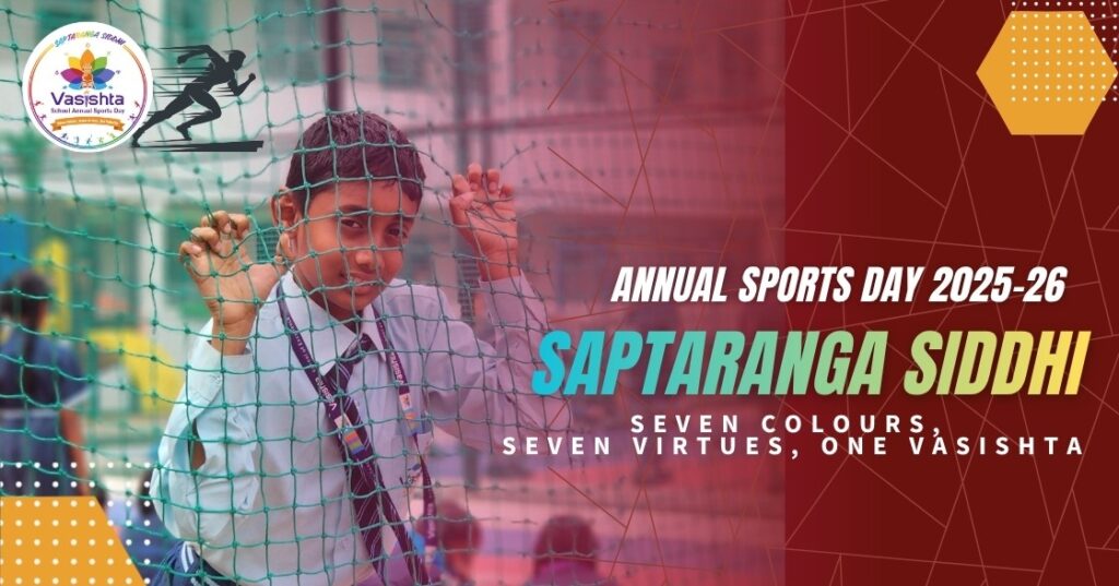 Namaste Dear Parents, Warm Greetings from Vasishta School of Excellence! We are delighted to announce that our Annual Sports Day 2025–26 is coming soon, celebrated under the inspiring theme SAPTARANGA SIDDHI – Seven Colours, Seven Virtues, One Vasishta, symbolizing strength, discipline, unity, and holistic growth — the true spirit of our children and our school. Please block the date: Sports Day – 29th November. More details and the complete schedule will be shared shortly. Let us come together to cheer, celebrate, and witness our children shine in the colours of excellence!